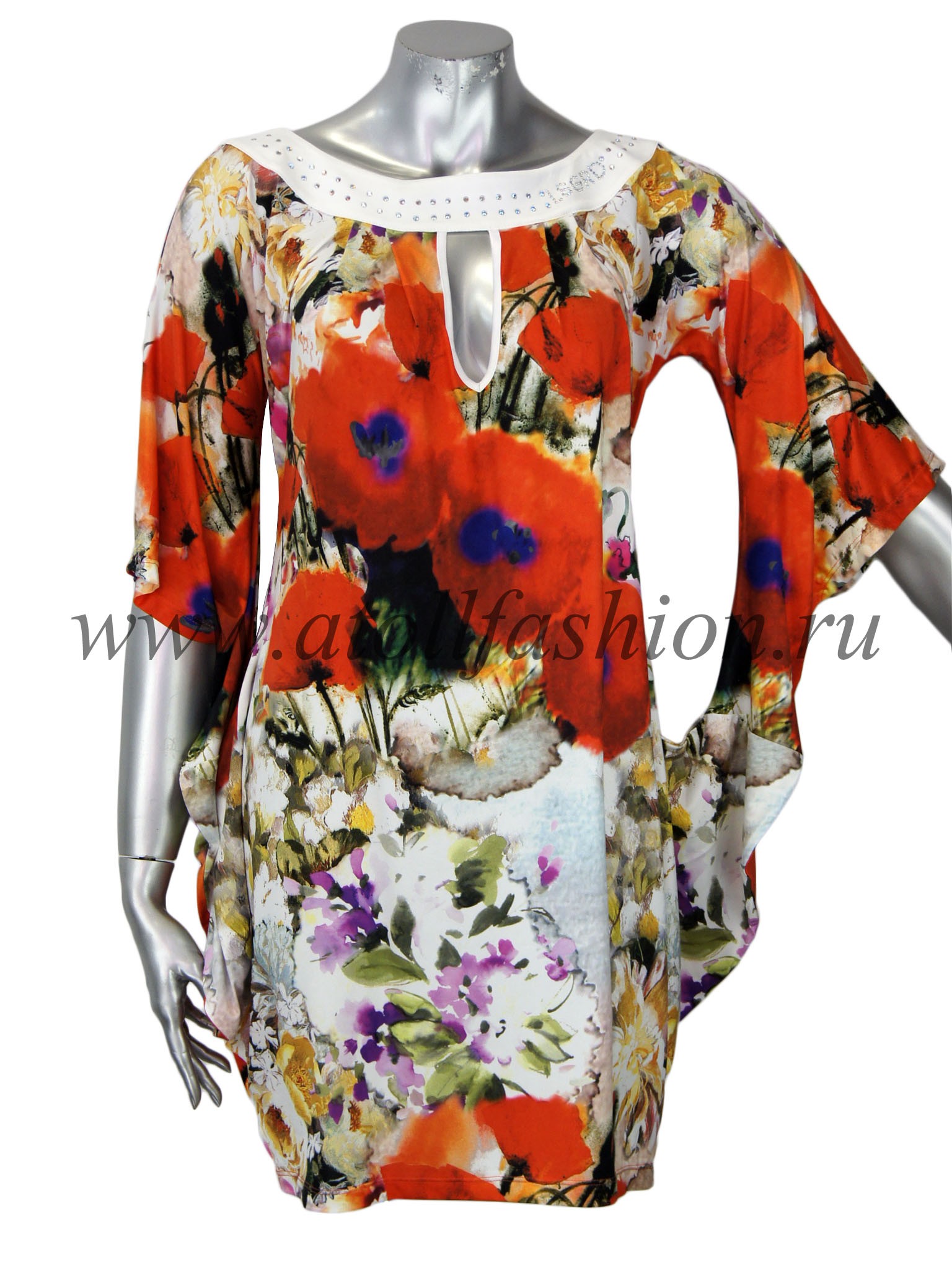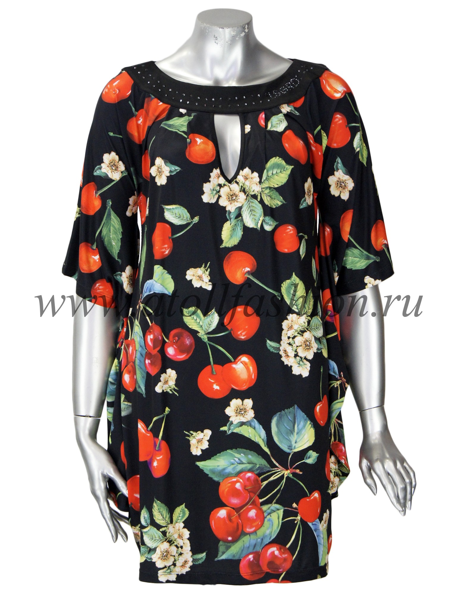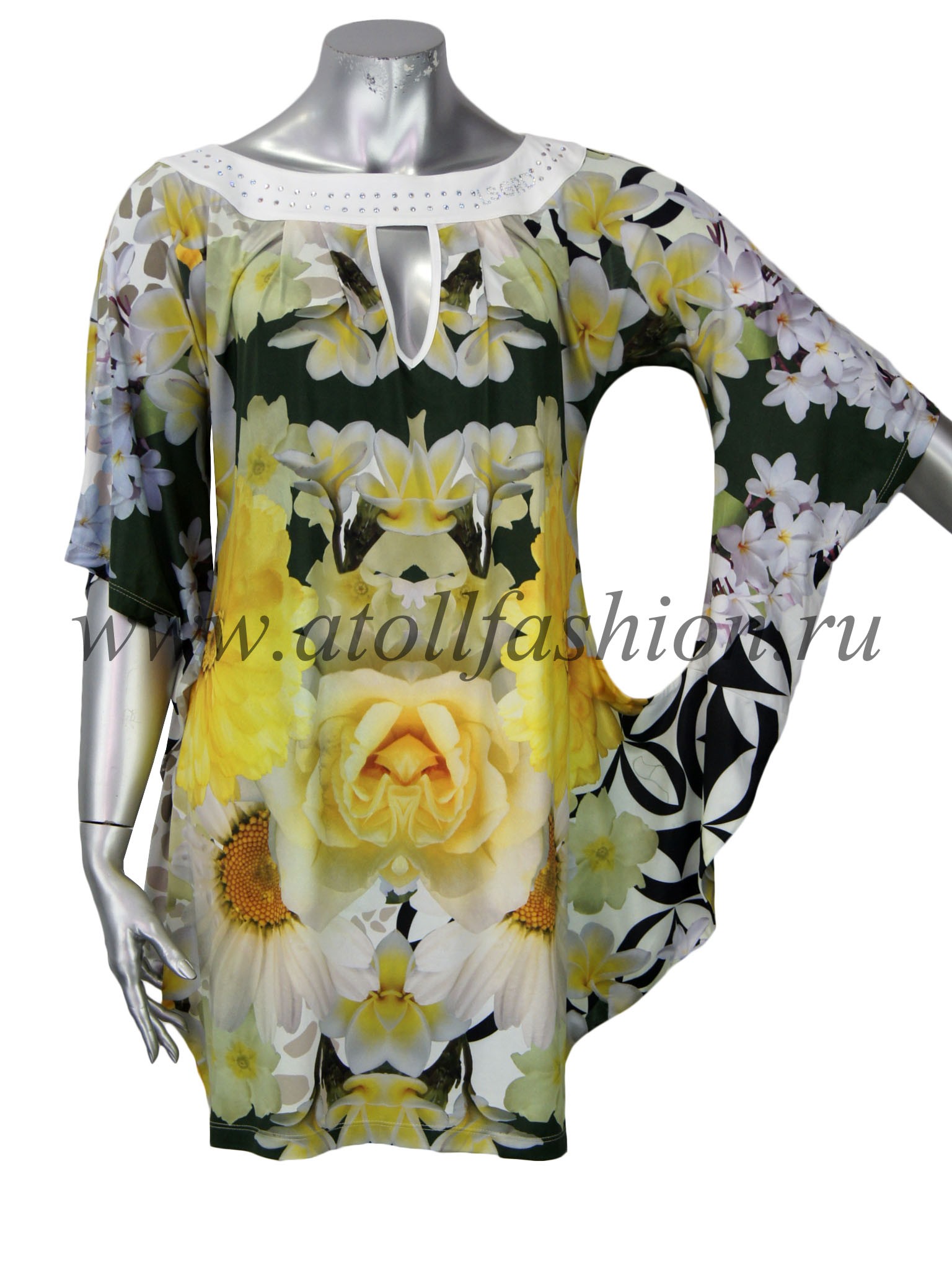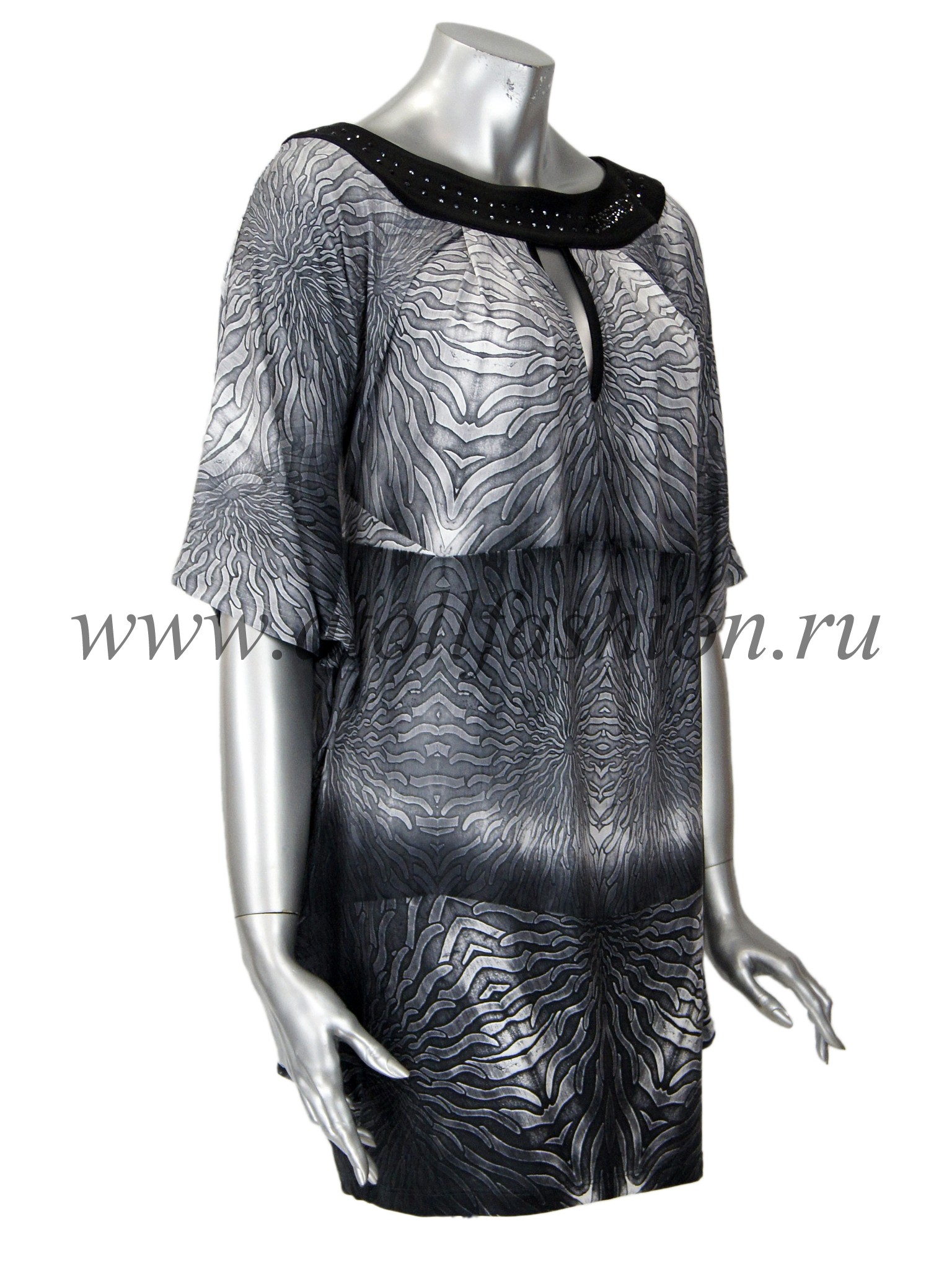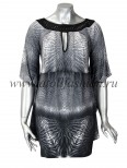Для дам, которые любят свободную просторную одежду, отлично подойдет эта модель платья. Его крой очень интересен и необычен: вверху платье собрано черной полосой горловины с яркими стразами, на груди имеется небольшой вырез, подчеркивающий зону декольте, а рукава частично соединены с боковиной, что создает эффект летящего силуэта при каждом движении рук.