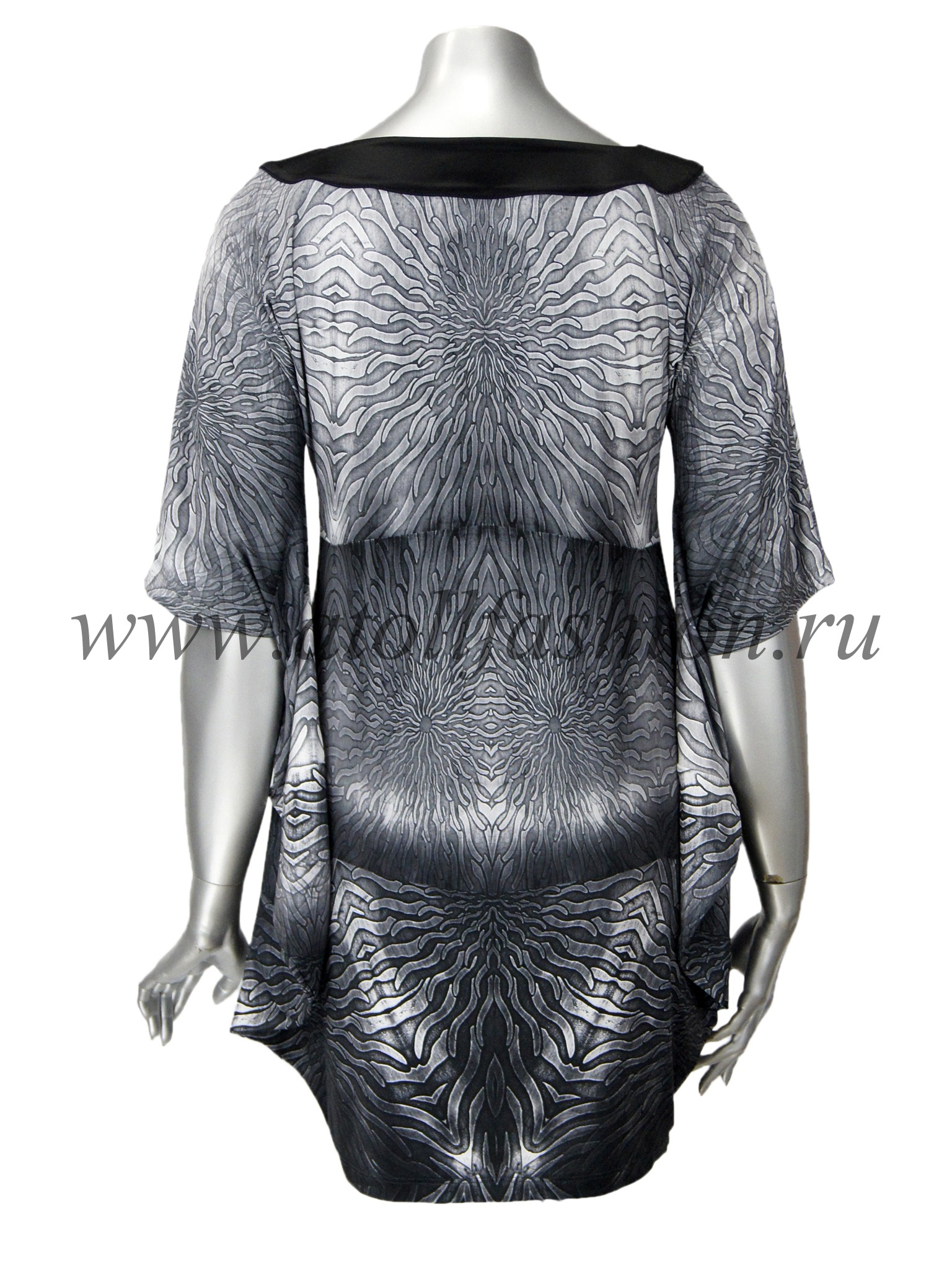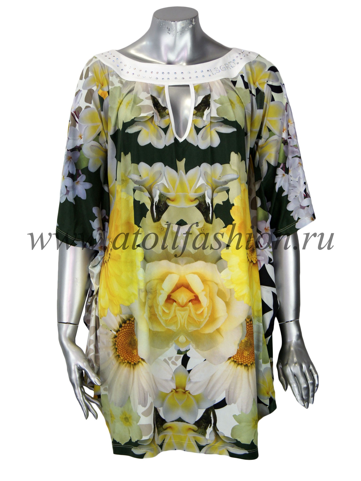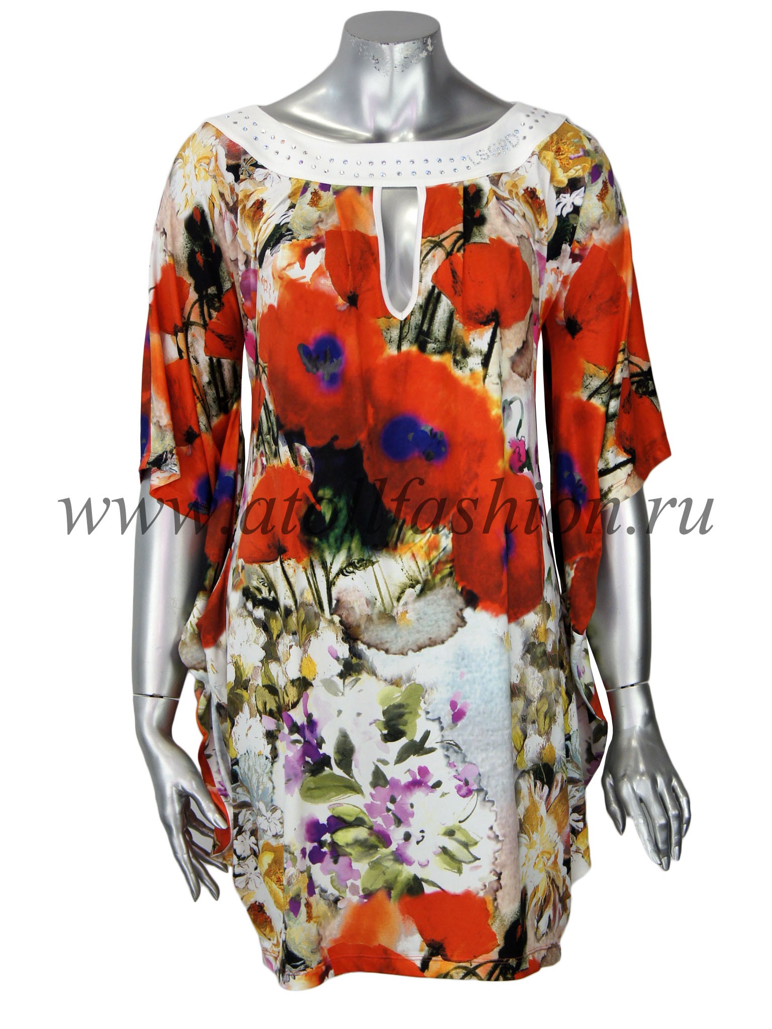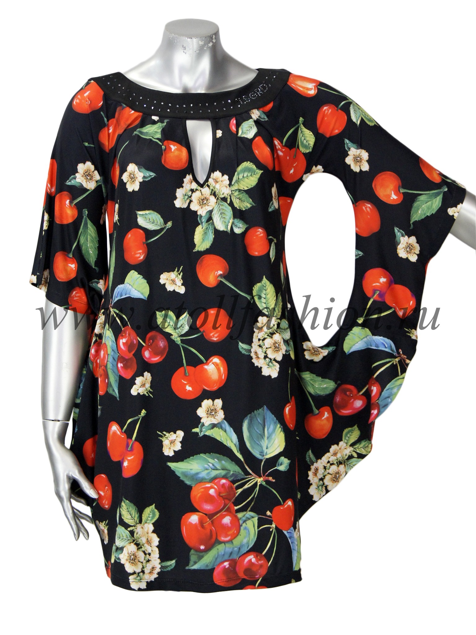 Для дам, которые любят свободную просторную одежду, отлично подойдет эта модель платья. Его крой очень интересен и необычен: вверху платье собрано черной полосой горловины с яркими стразами, на груди имеется небольшой вырез, подчеркивающий зону декольте, а рукава частично соединены с боковиной, что создает эффект летящего силуэта при каждом движении рук.
