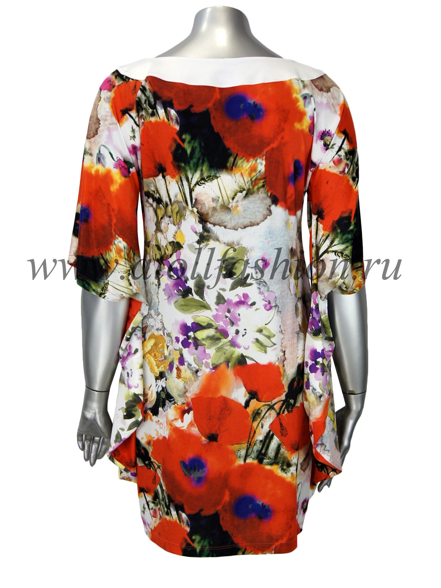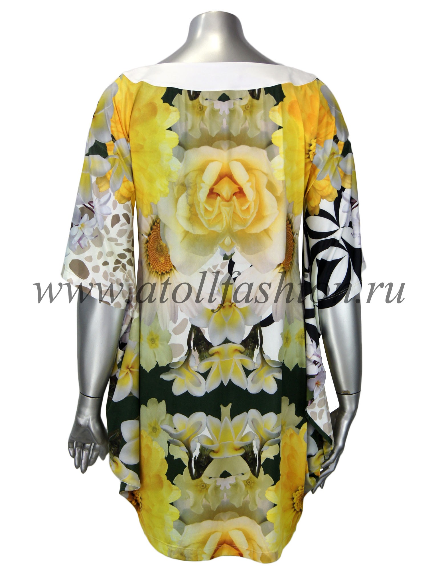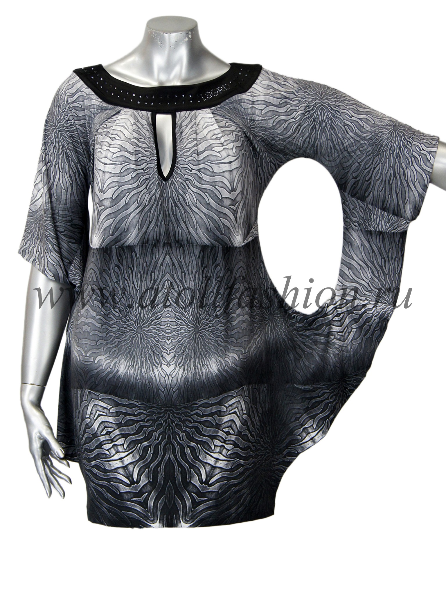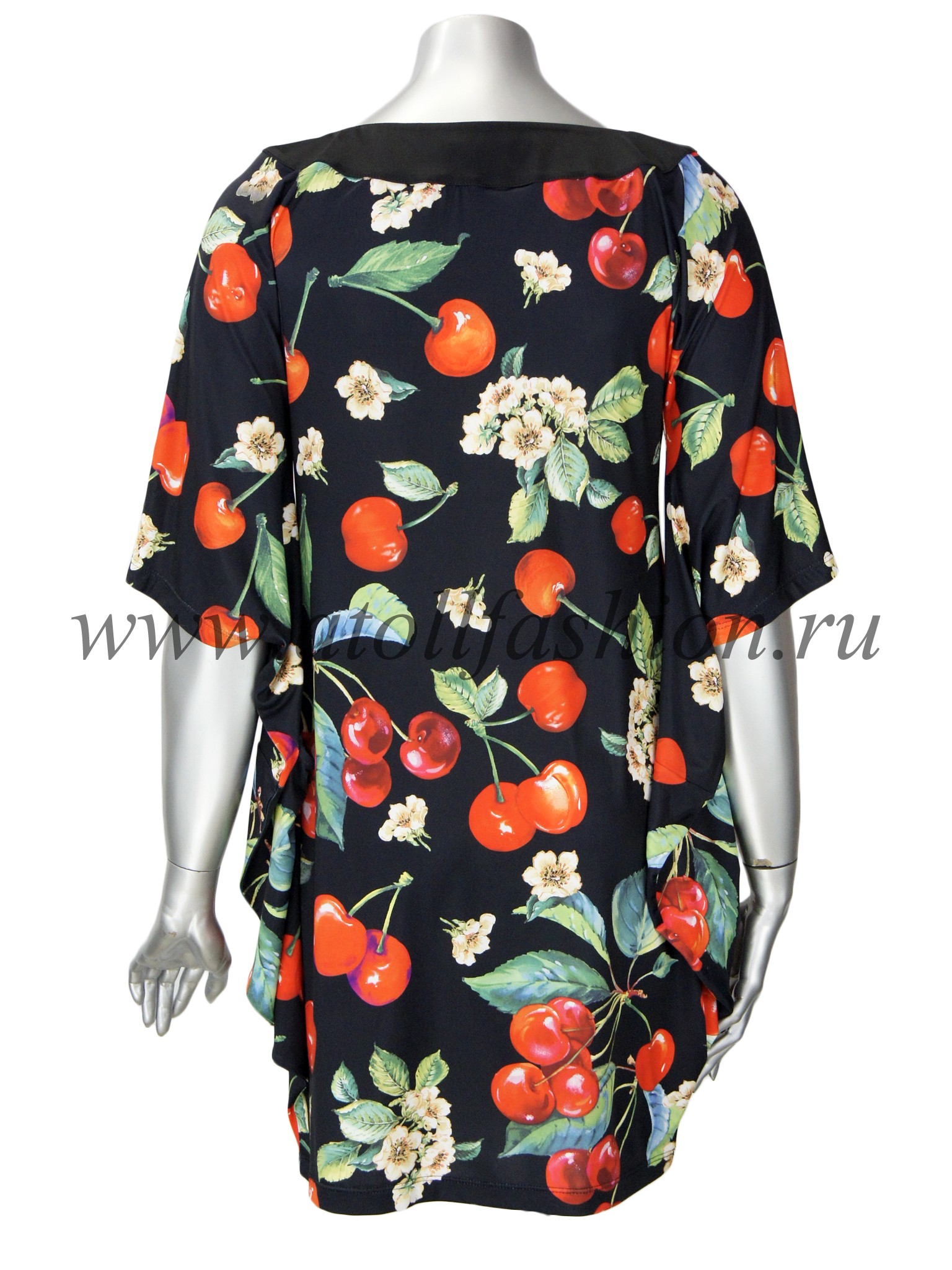 Для дам, которые любят свободную просторную одежду, отлично подойдет эта модель платья. Его крой очень интересен и необычен: вверху платье собрано черной полосой горловины с яркими стразами, на груди имеется небольшой вырез, подчеркивающий зону декольте, а рукава частично соединены с боковиной, что создает эффект летящего силуэта при каждом движении рук.